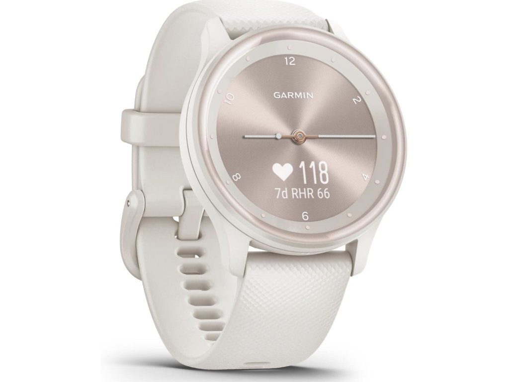 Garmin Vívomove Sport Peach Gold / Ivory Band jsou elegantní hybridní hodinky, které kombinují klasický analogový vzhled s moderními chytrými funkcemi. Na první pohled vypadají jako stylové klasické hodinky, ale pod ručičkami se skrývá dotykový displej, který se zobrazí pouze při používání.